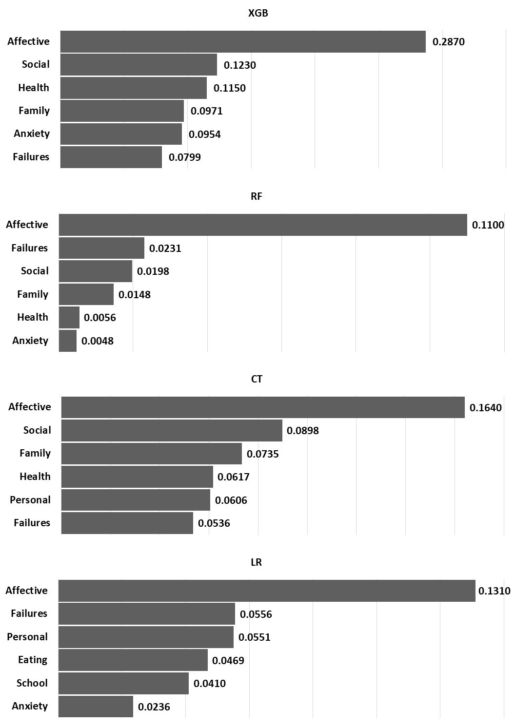 Failures and personal life events were particularly relevant in the LR and CT models, indicating that adolescents’ responses to difficulties and personal challenges may also play a role in suicidal risk. Interestingly, eating and school-related life events were unique to the LR model, where they carried modest but notable importance.